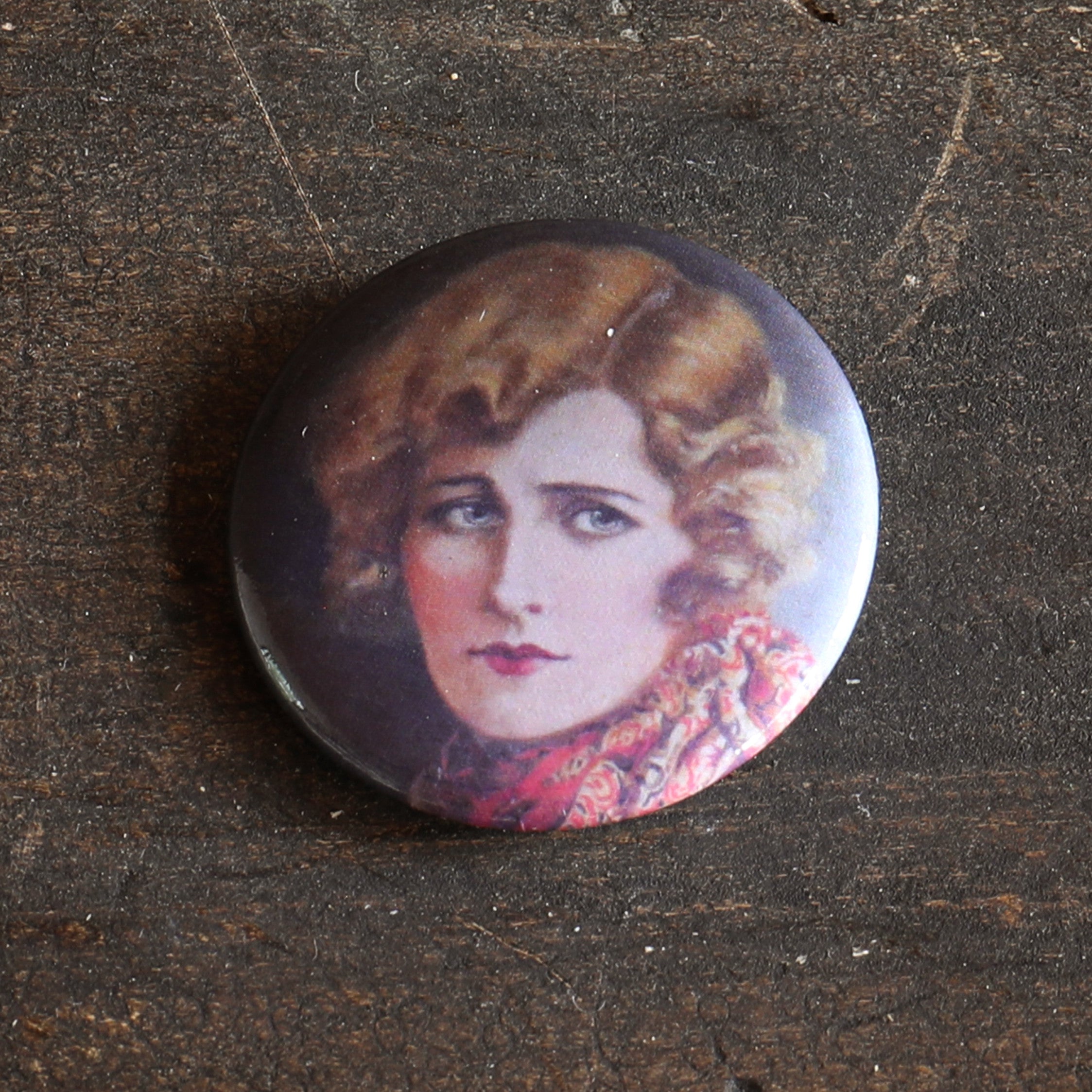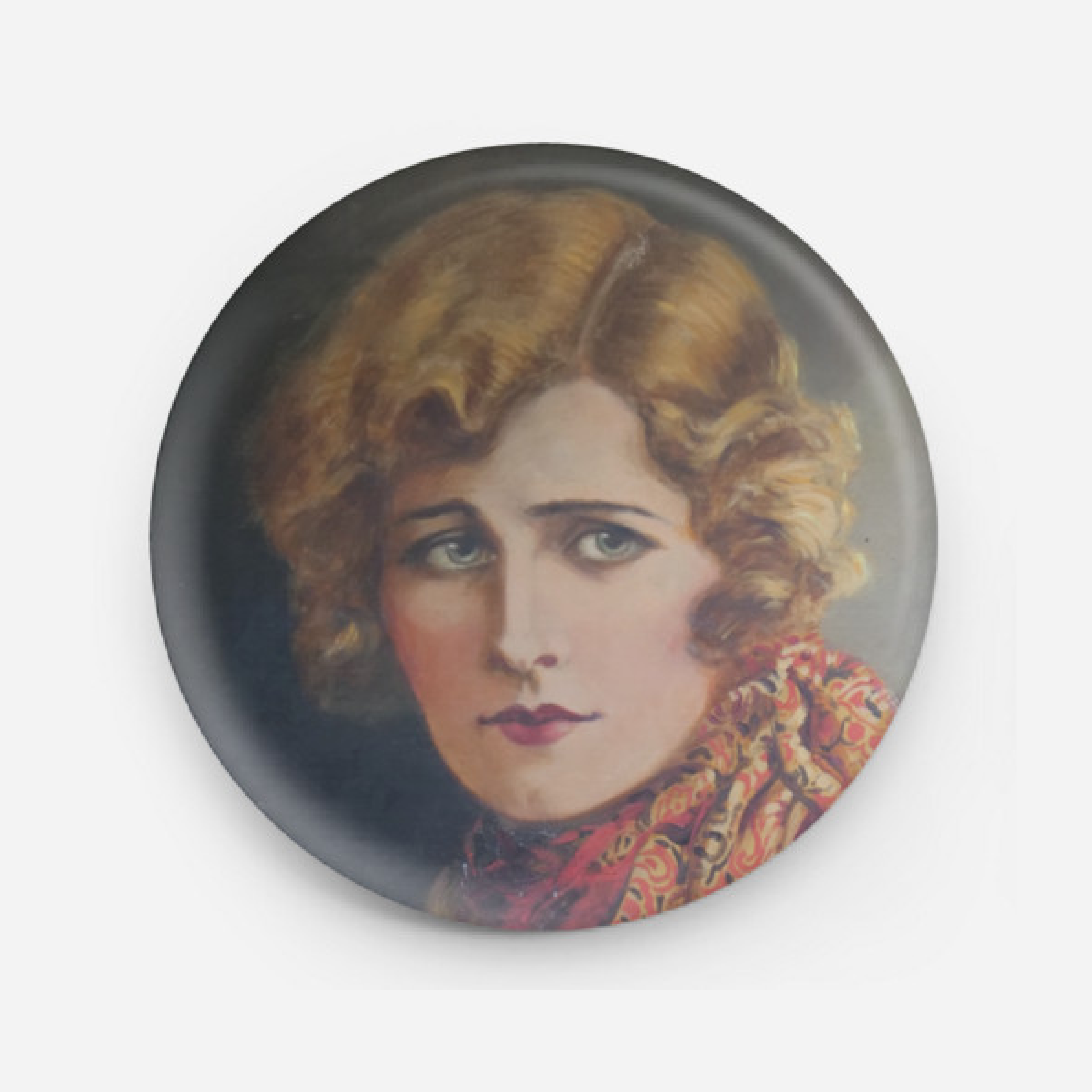 Heather: A charming accessory featuring a vintage portrait of a woman in a striking red and gold scarf.