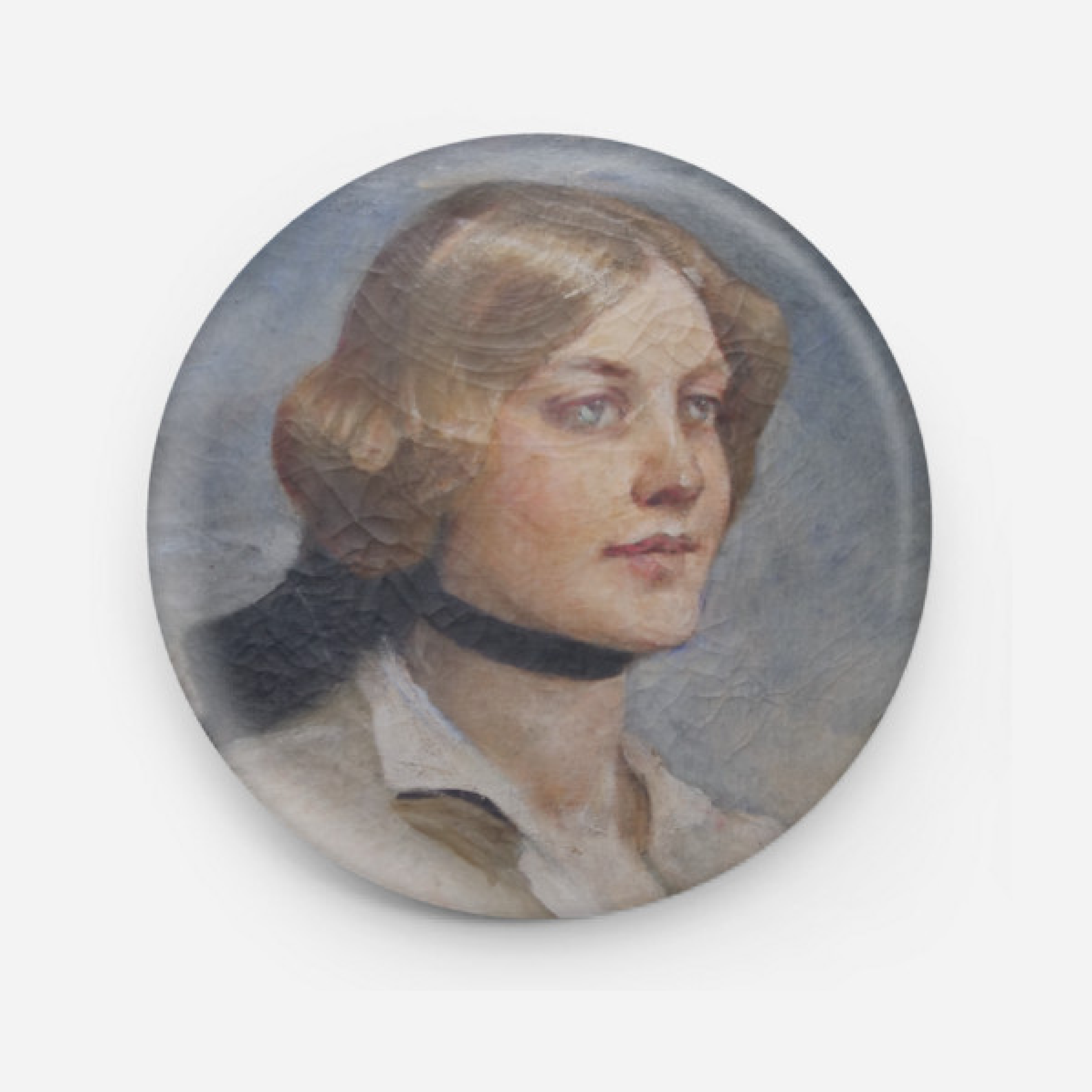 Rosemary stands by the sea, looking wistfully towards the horizon in a calm, serene portrait. This button badge is ideal for lovers of classic painted portraits and is perfect for adding inspiration and charm to your coats, jackets or bags.