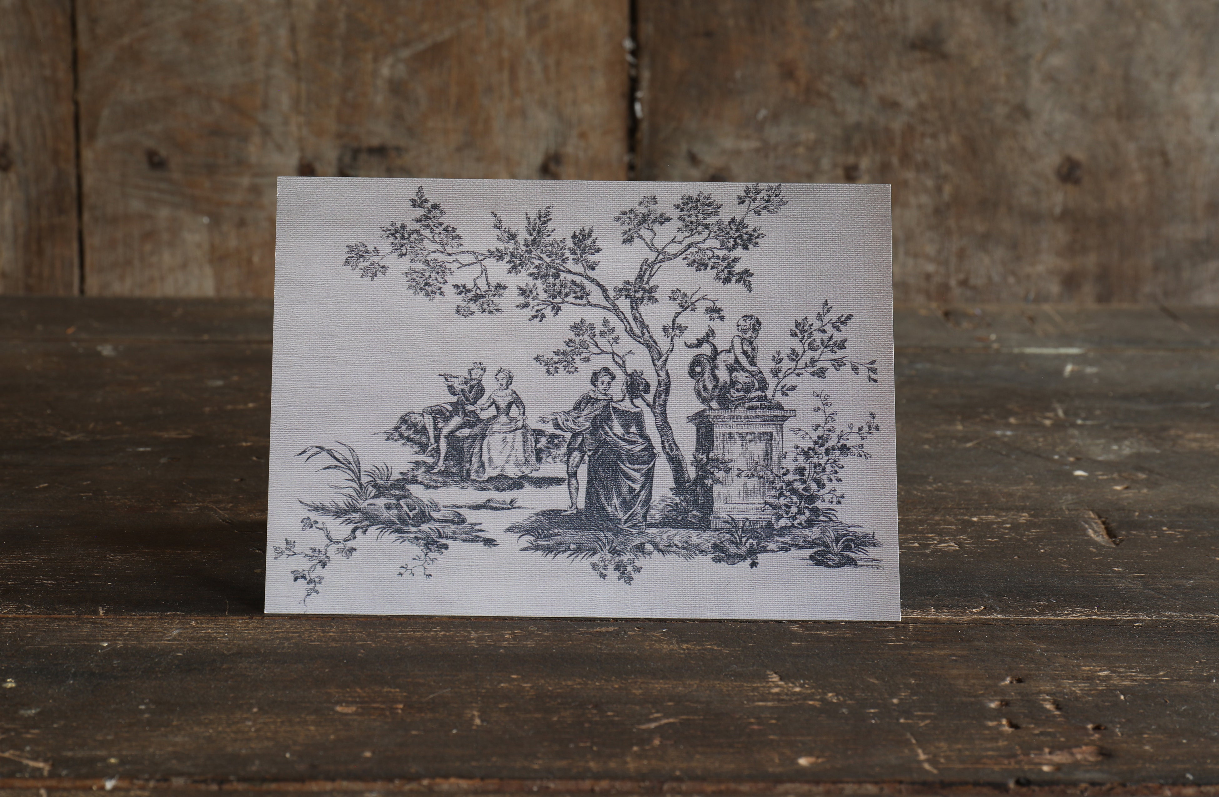 Taken from a piece of antique wallpaper, this beautifully textured Toile du Juoy card celebrates the romance of 18th century French countryside. A sophisticated design for lovers of French heritage, vintage wallpaper, and designs that tell a story.