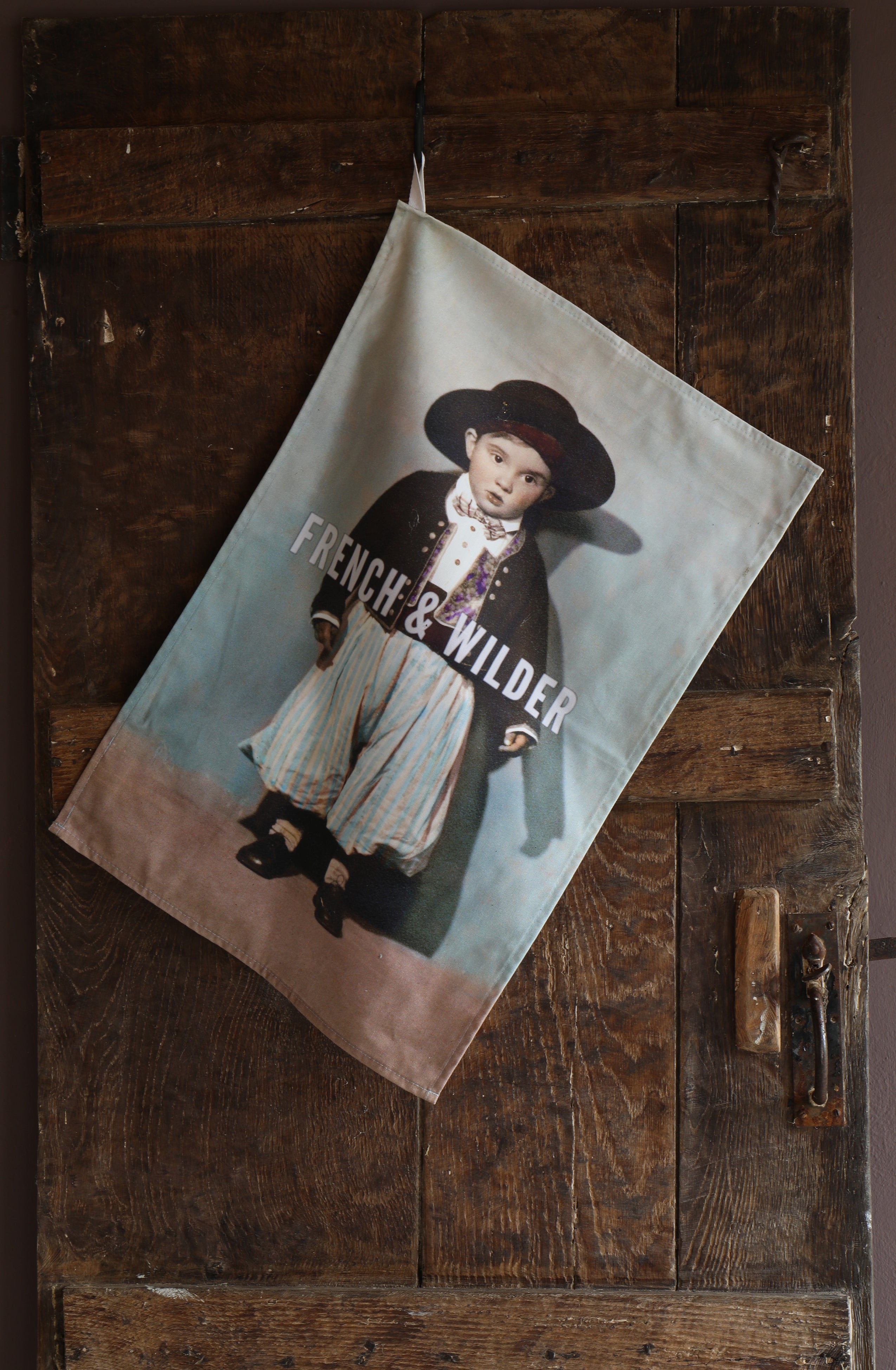 The design features a colourised image of a young boy from the early 20th century dressed in traditional attire. He wears billowy striped pantaloons, a crisp white shirt, an intricate waistcoat and striped bow tie, topped off with a wide-brimmed hat perched proudly on his head. Discovered on a tiny photograph at a car boot sale, we can only imagine how he felt about his attire. But his timeless charm and innocent gaze confidence won our hearts - and now he's ready to win yours!