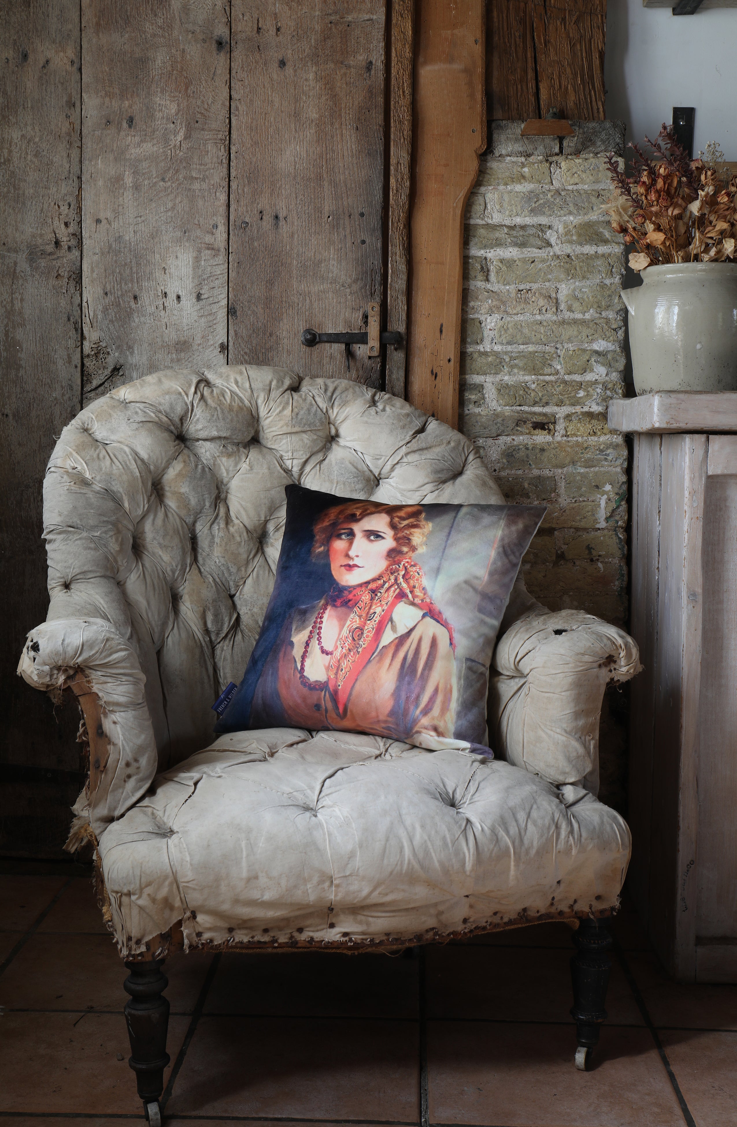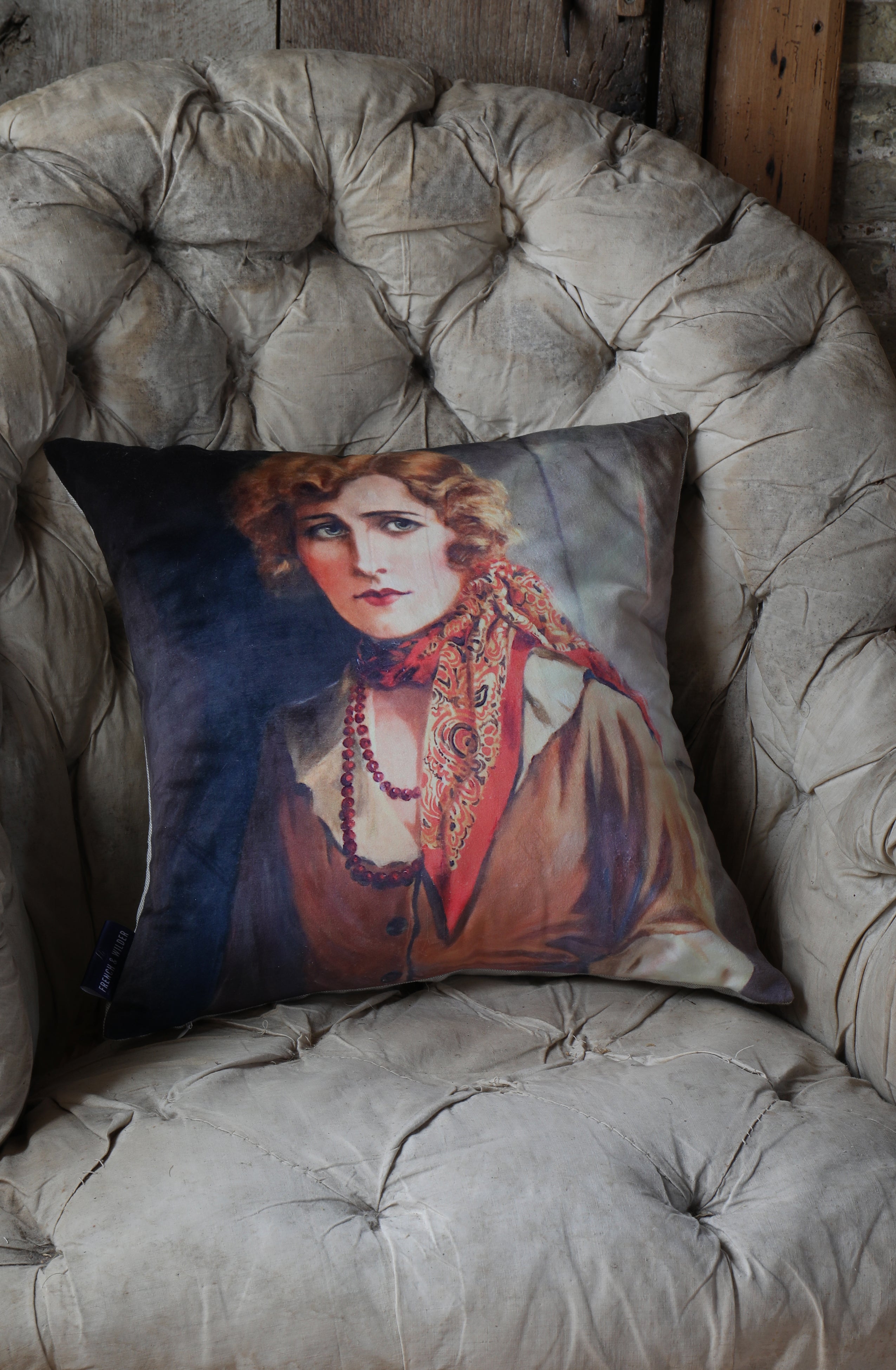 Add a touch of timeless charm to your home with the Heather velvet cushion, a design that captures the quiet elegance of yesteryear. Inspired by a portrait of a woman with striking presence and early 20th-century style, this cushion brings character, warmth, and artistry to any interior. Heather's thoughtful gaze and the muted, textured background evoke the grace and poise of vintage portraiture. Printed on sumptuous velvet, the cushion has a soft, tactile finish that invites touch while adding depth to the artwork.