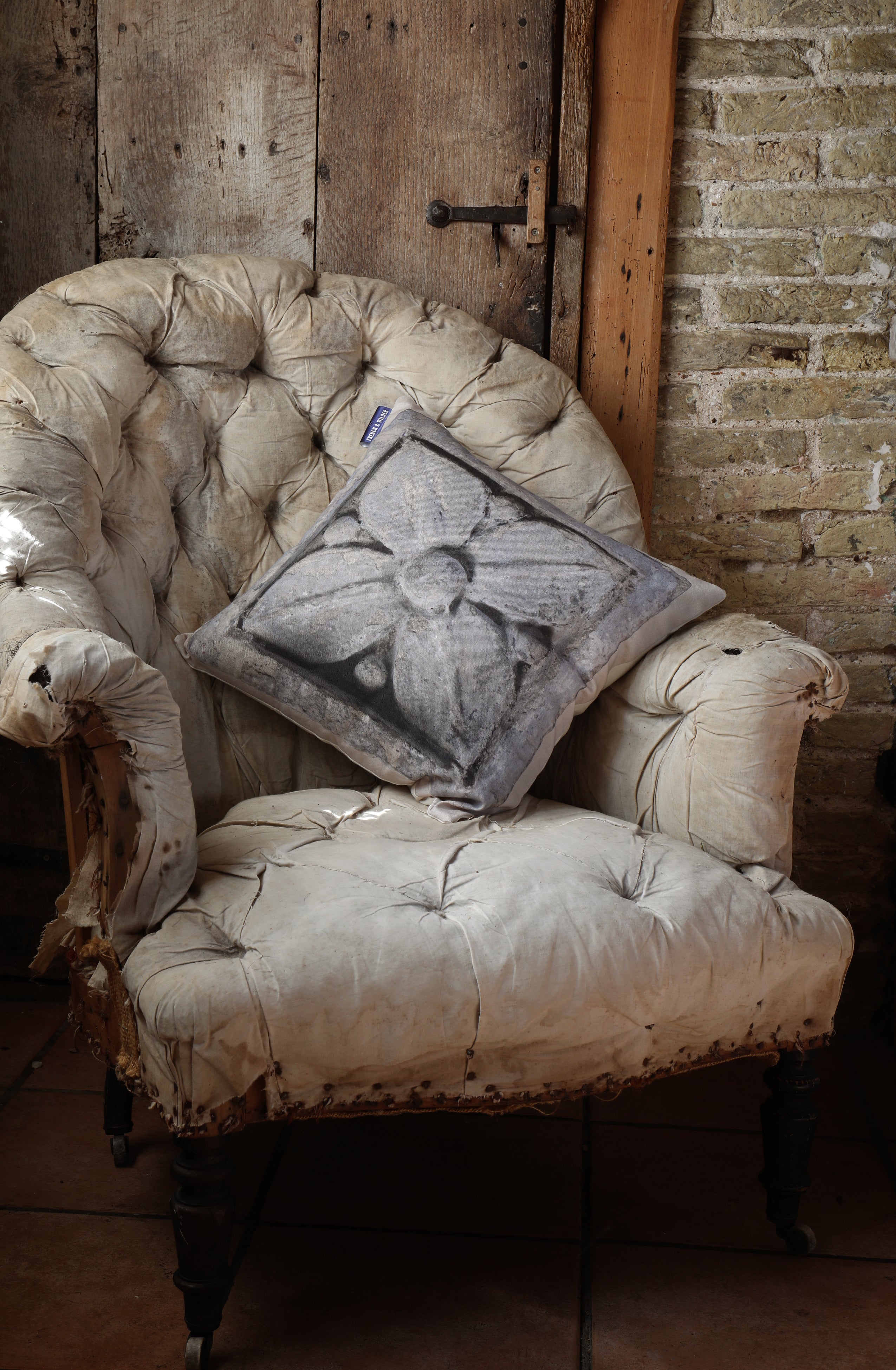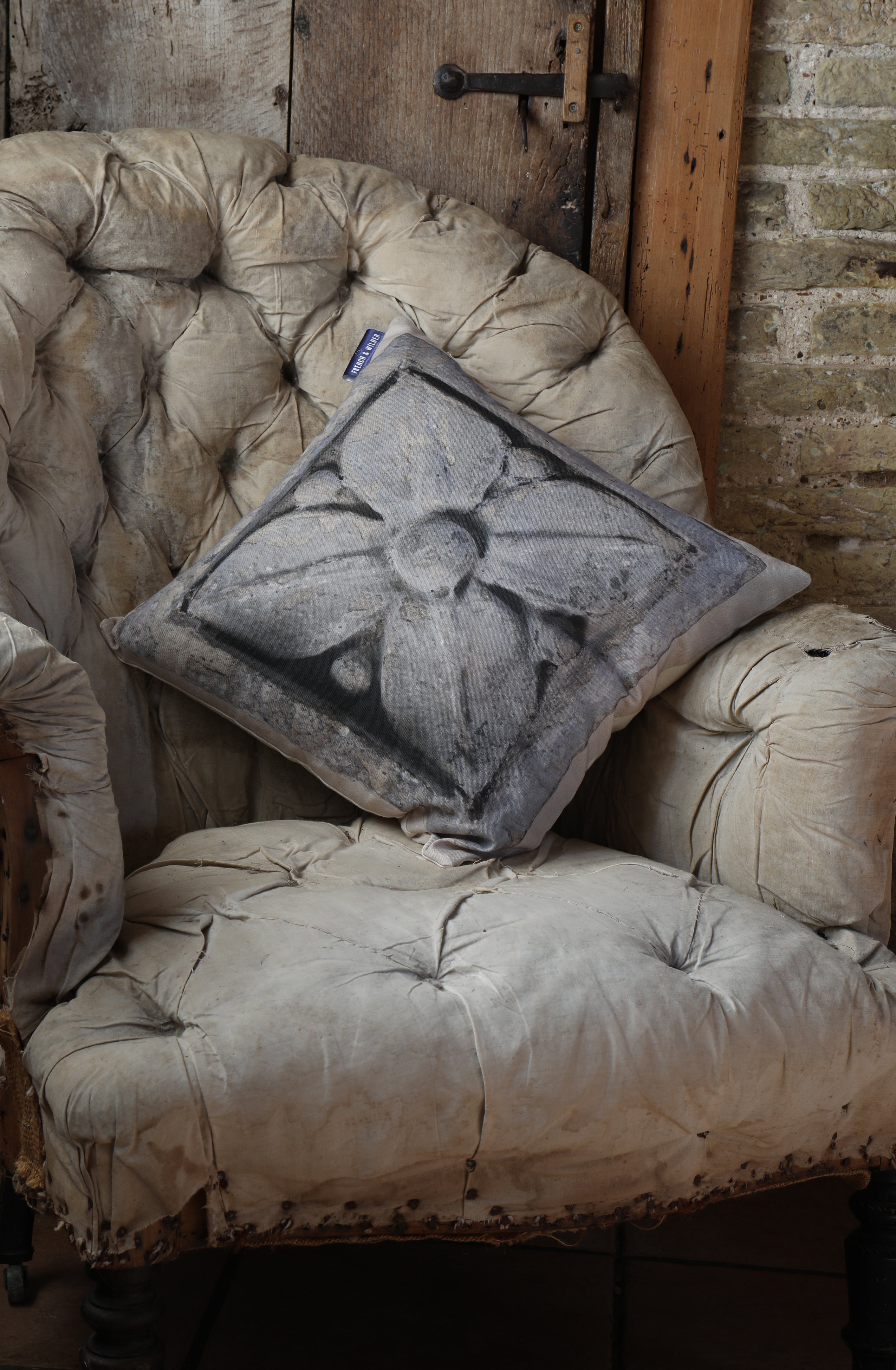 Bring some sculptural elegance into your home with this decorative stone cushion. Created from an architectural adornment, it creates a striking floral motif with petals radiating symmetrically, framed by a square border. Weathered textures and natural aging are captured creating an authentically worn look in grey and beige tones. Constructed in soft organic cotton, this is an inviting piece, ideal for those who love classical, refined style with real history.