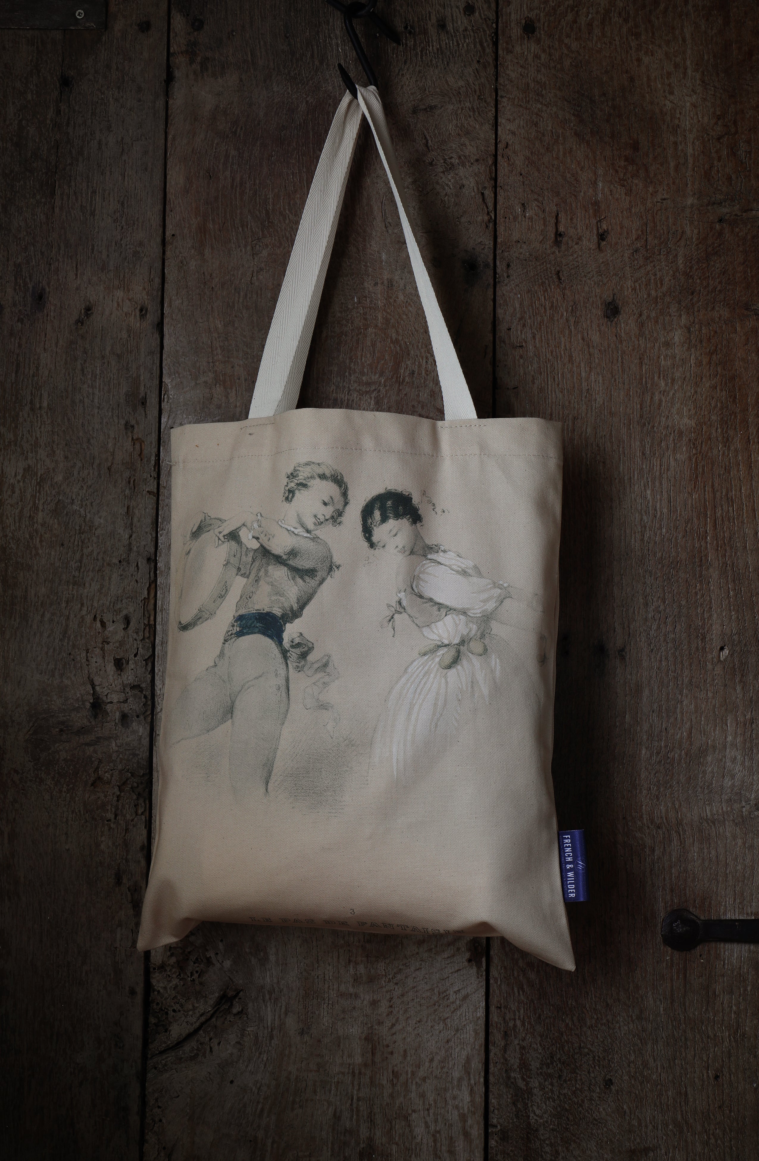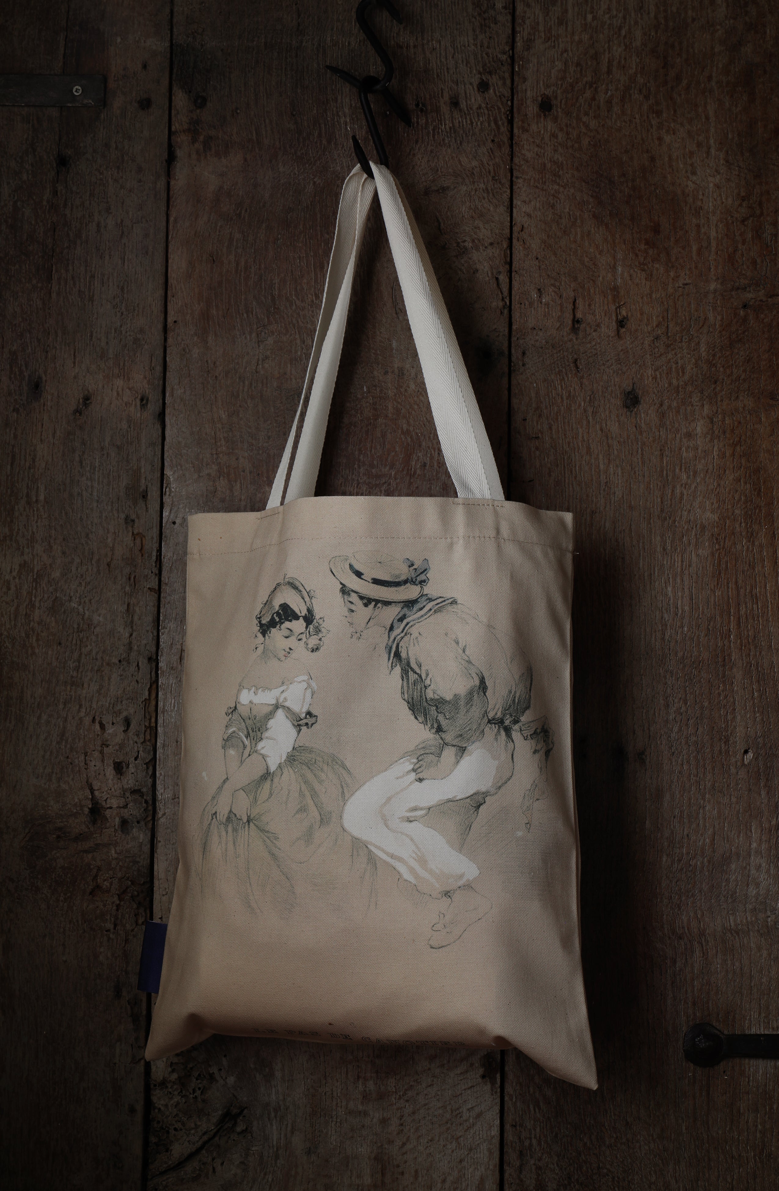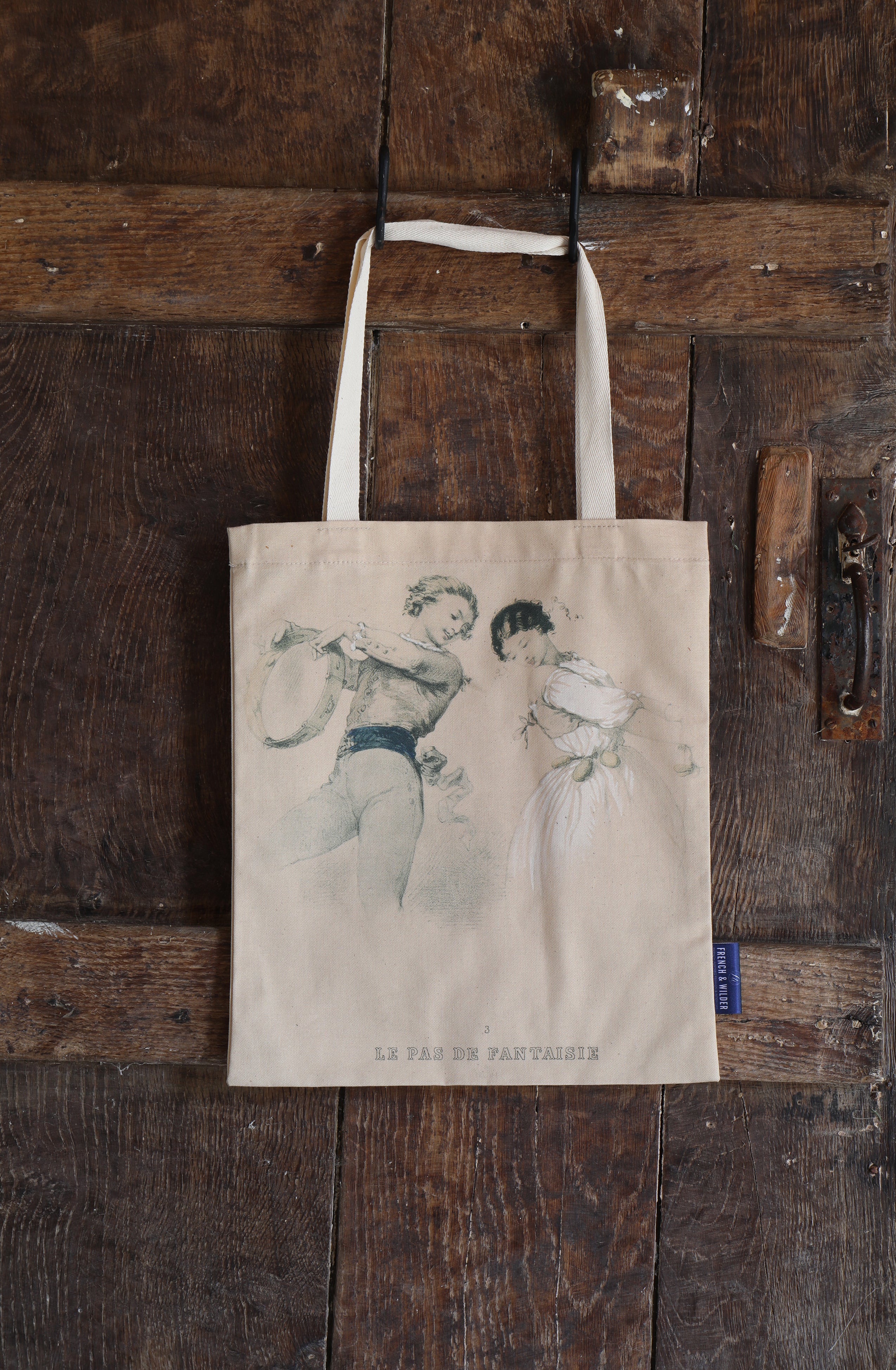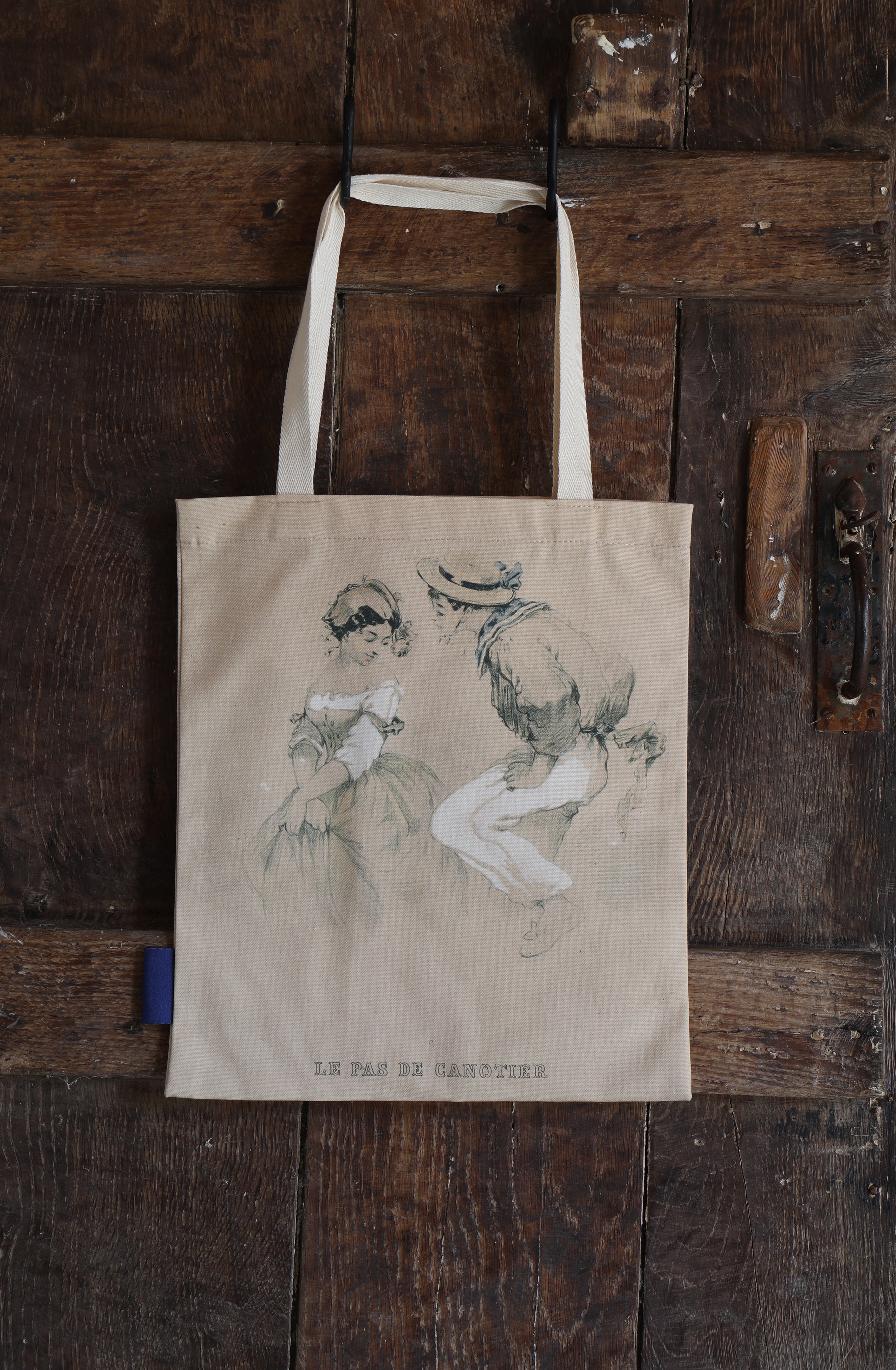 Carry a piece of grace and charm with this beautiful bag, depicting young French period dancers. Taken from vintage sketches, the design has different images on front and back showing a sailor in his boater's hat with a lady dressed elegantly in a voluminous dress. It brings to life the playful energy of these two dancers, capturing a fleeting moment in time. The bag is crafted from durable cotton, combining practicality with distinctive, stylish design. An ideal purchase for lovers of art-led and vintage pieces.